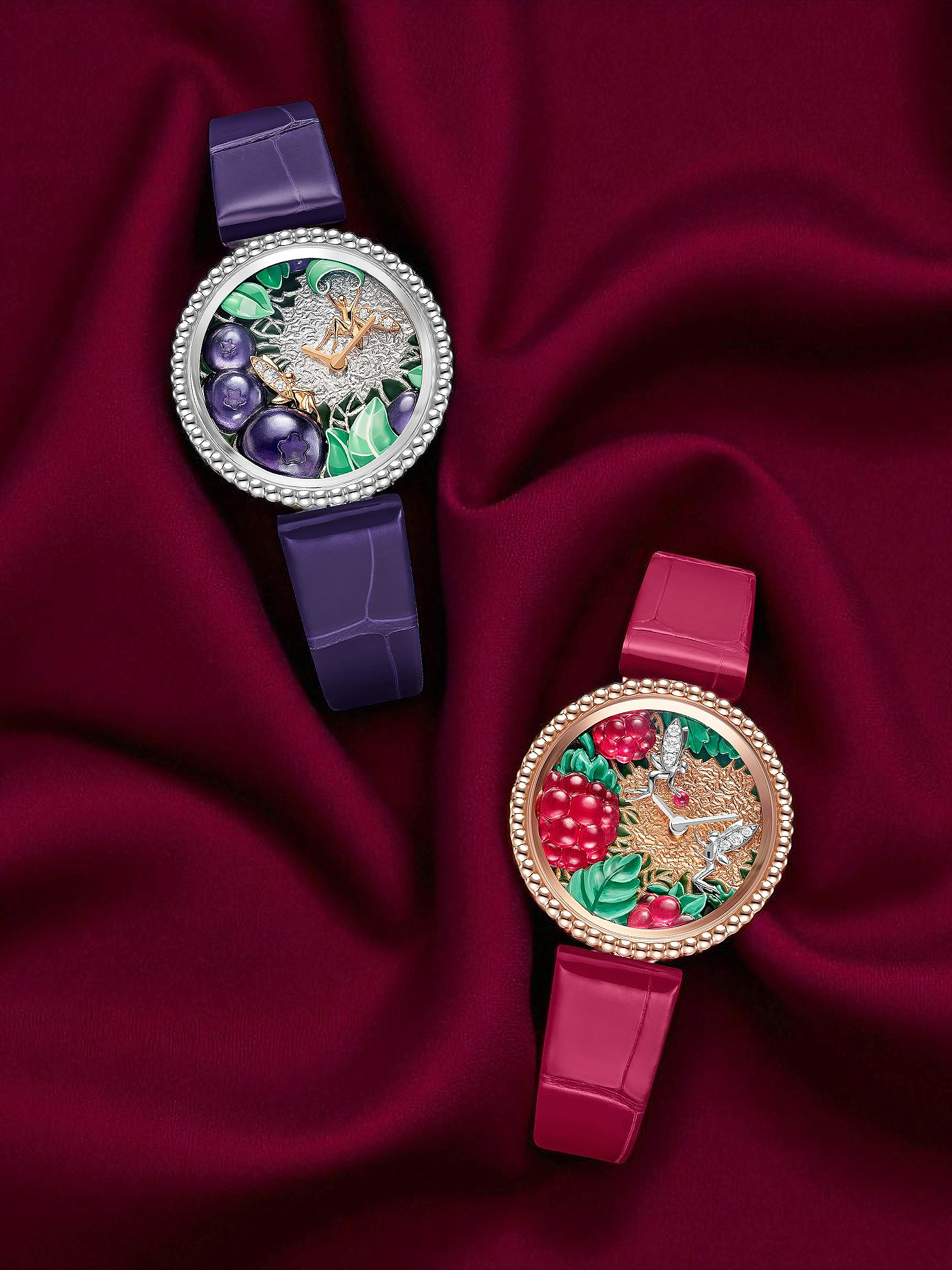 Hai tác phẩm tựa như những bức tiểu họa 3D sống động, tái hiện một khung cảnh đầy mê hoặc. Trên mặt số, những quả mọng căng tròn, óng ả được tạo hình hoàn hảo từ kỹ thuật tráng men façonné độc quyền, rực rỡ và ngọt ngào như đang chờ được thu hái. Bao quanh chúng là những tán lá mảnh mai được vẽ tiểu họa tinh xảo, nổi bật trên nền vàng được xử lý bề mặt để gợi lên chiều sâu của một khu rừng ngập nắng.